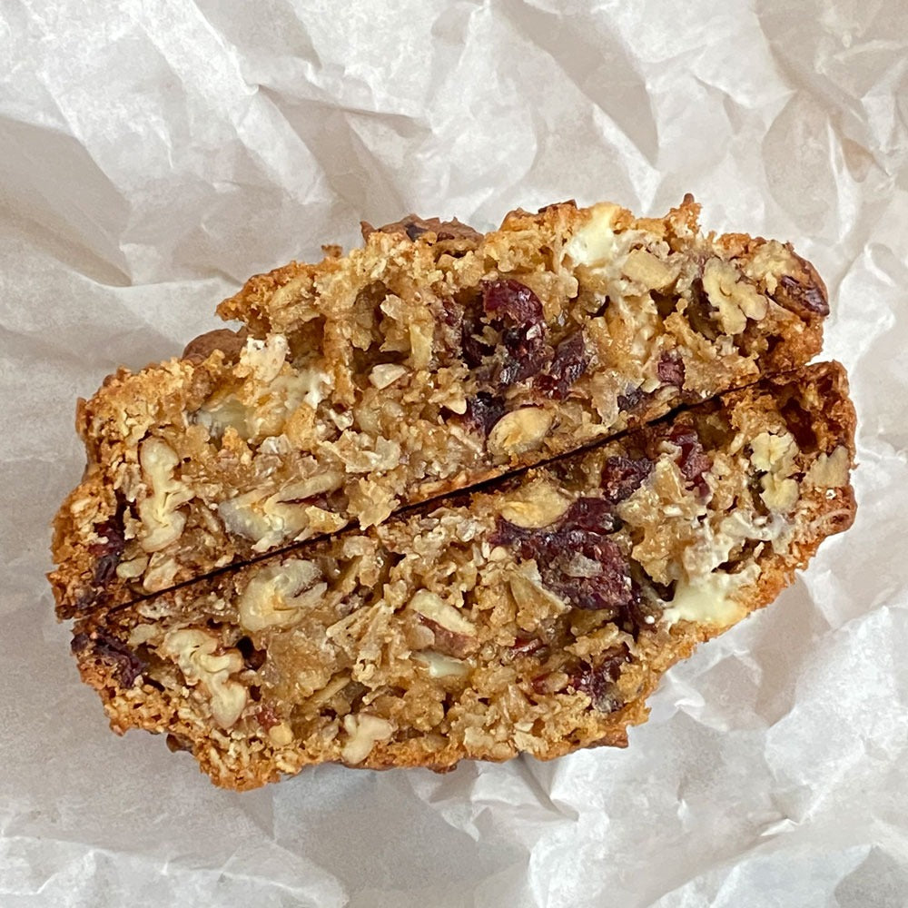 Spiced oatmeal cookie with cranberry, white chocolate, coconut and pecans.