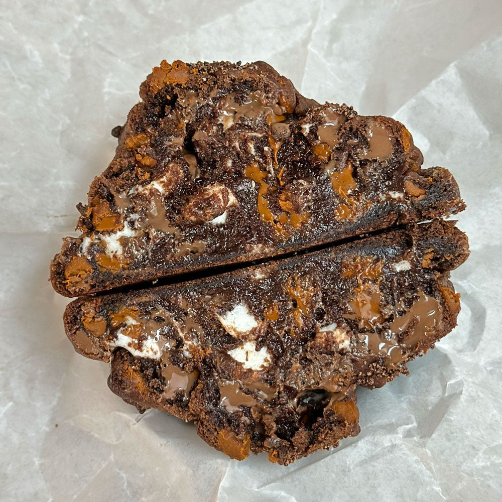 Spiced chocolate cookie with milk and cinnamon chocolate chips and mini marshmallows.
